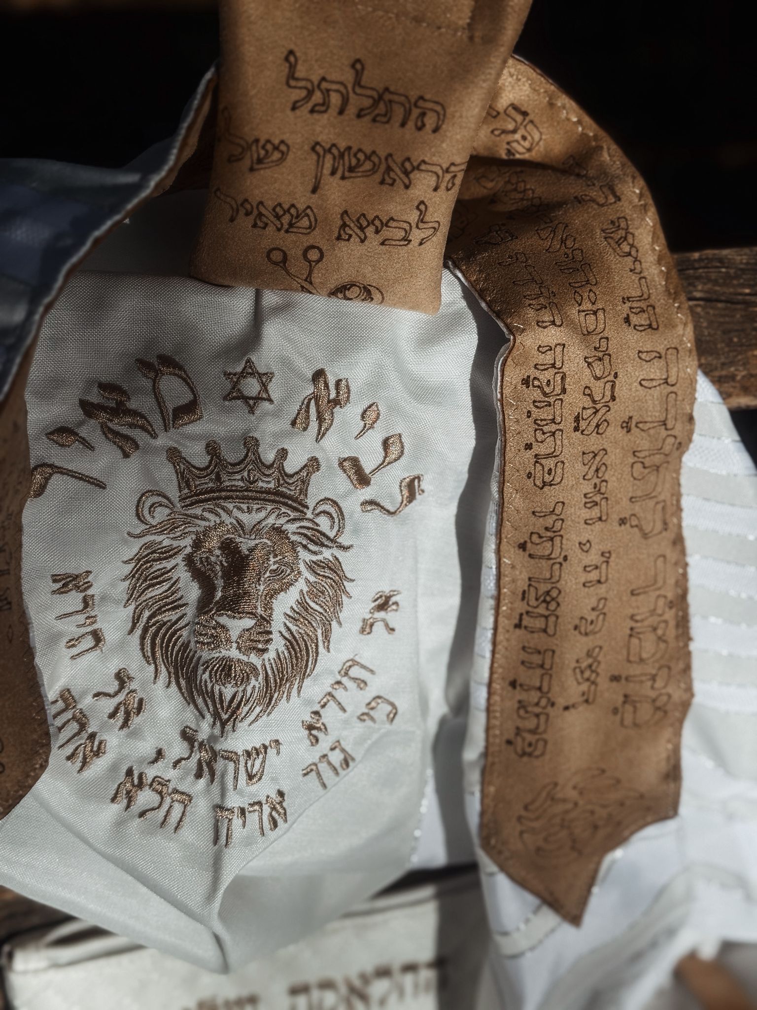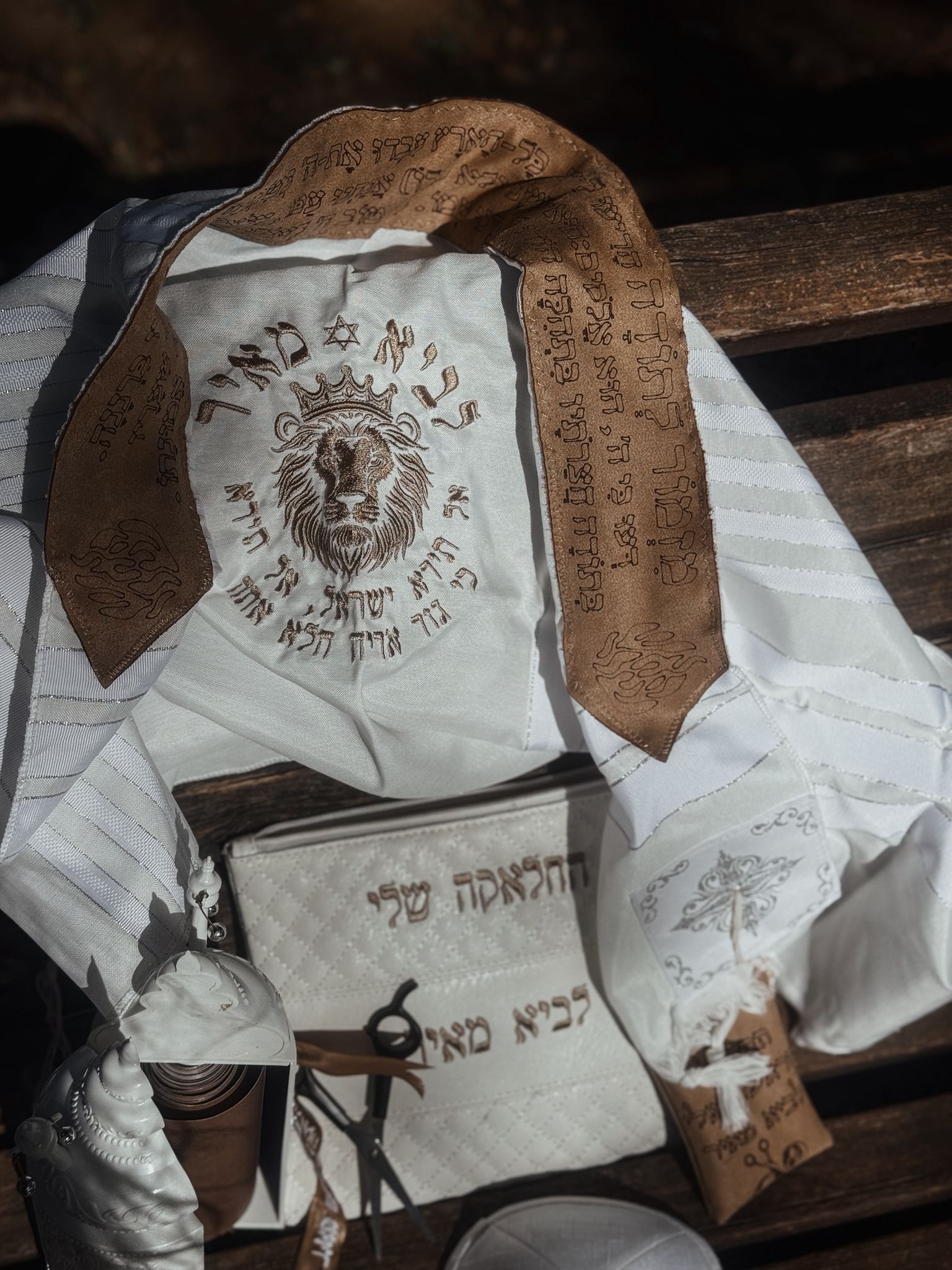 טלית חלאקה עם רקמת אריה ומשפט "אל תירא ישראל אל תירא כי גור אריה הלא אתה" + עטרה עם חריטת לייזר של מזמור לתודה + נרתיק תואם של התלתל הראשון עם חריטת לייזר של שם הילד + כיפת פשתן לבנה עם רקמת שם הילד + מספריים עם סרט עליו רקום " החלאקה של..ושם הילד" (צבע הסרט או לבן עם רקמה קפה או קפה עם רקמה לבנה לפי מה שקיים במלאי**) +תיק דמוי עור עם רקמת