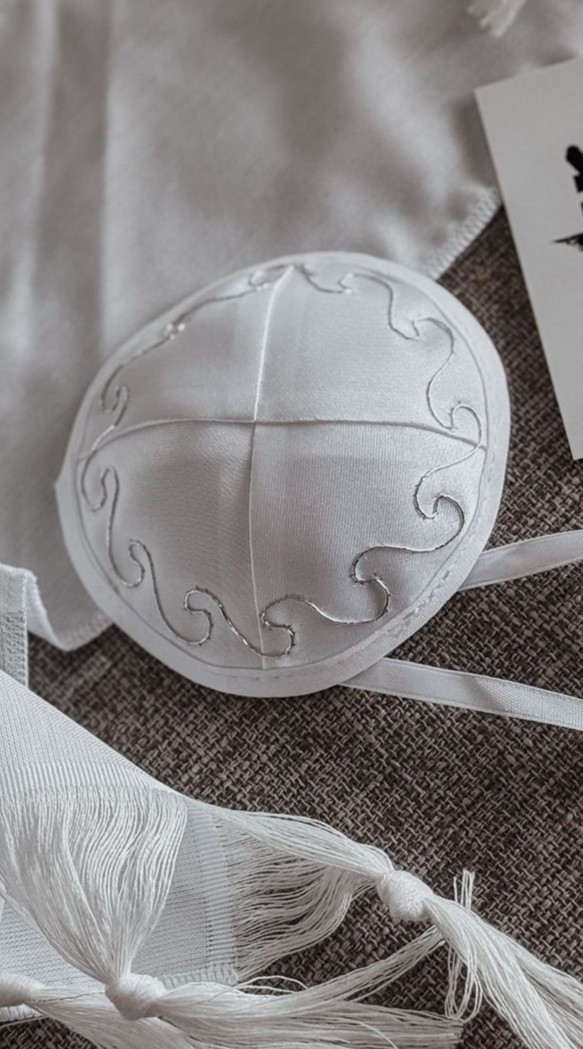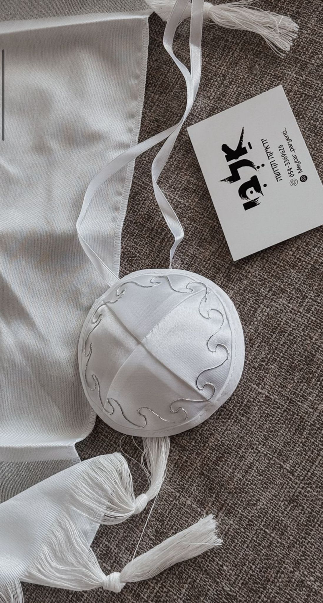 כיפה לברית לתינוק מבד סארן עם עיטורים וחוטי קשירה