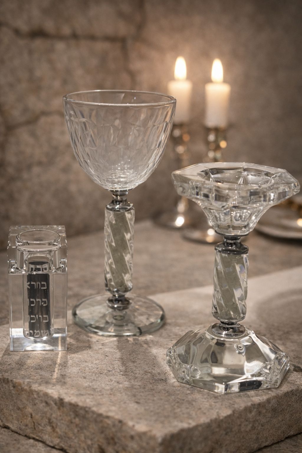 סא הבדהל קריסטל מהודר הכולל גביע ליין , פמוט קריסטל ובשמים קריסטל עם חריטה "בורא מיני בשמים "