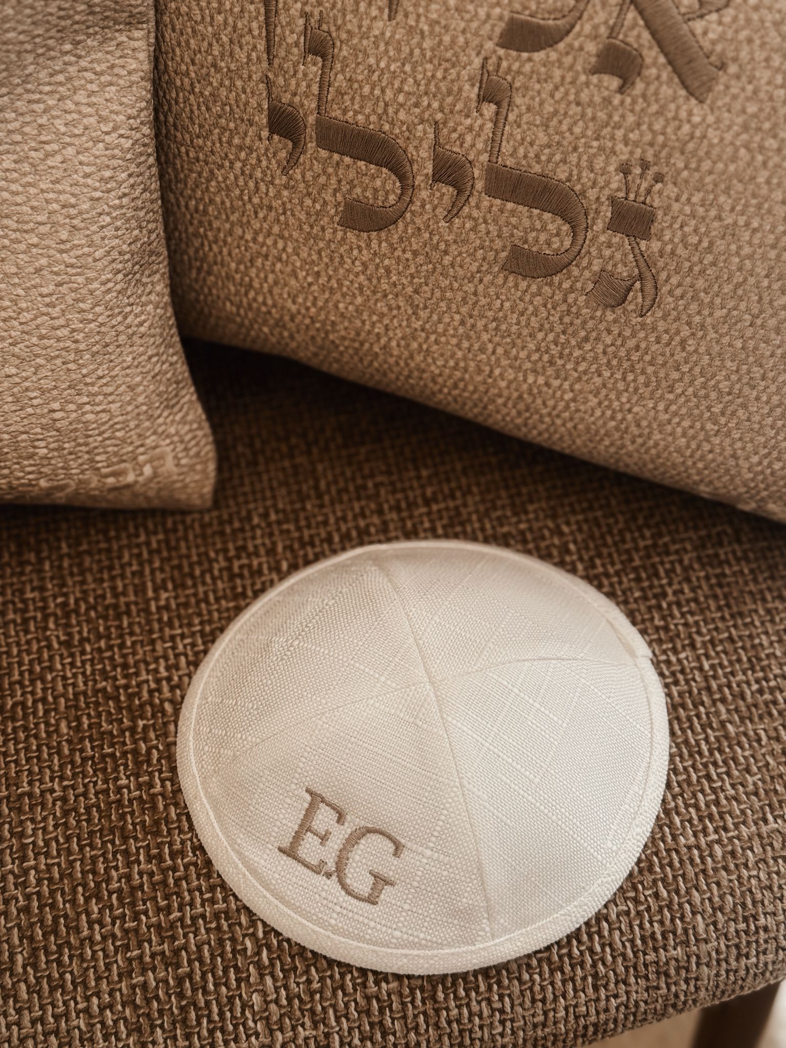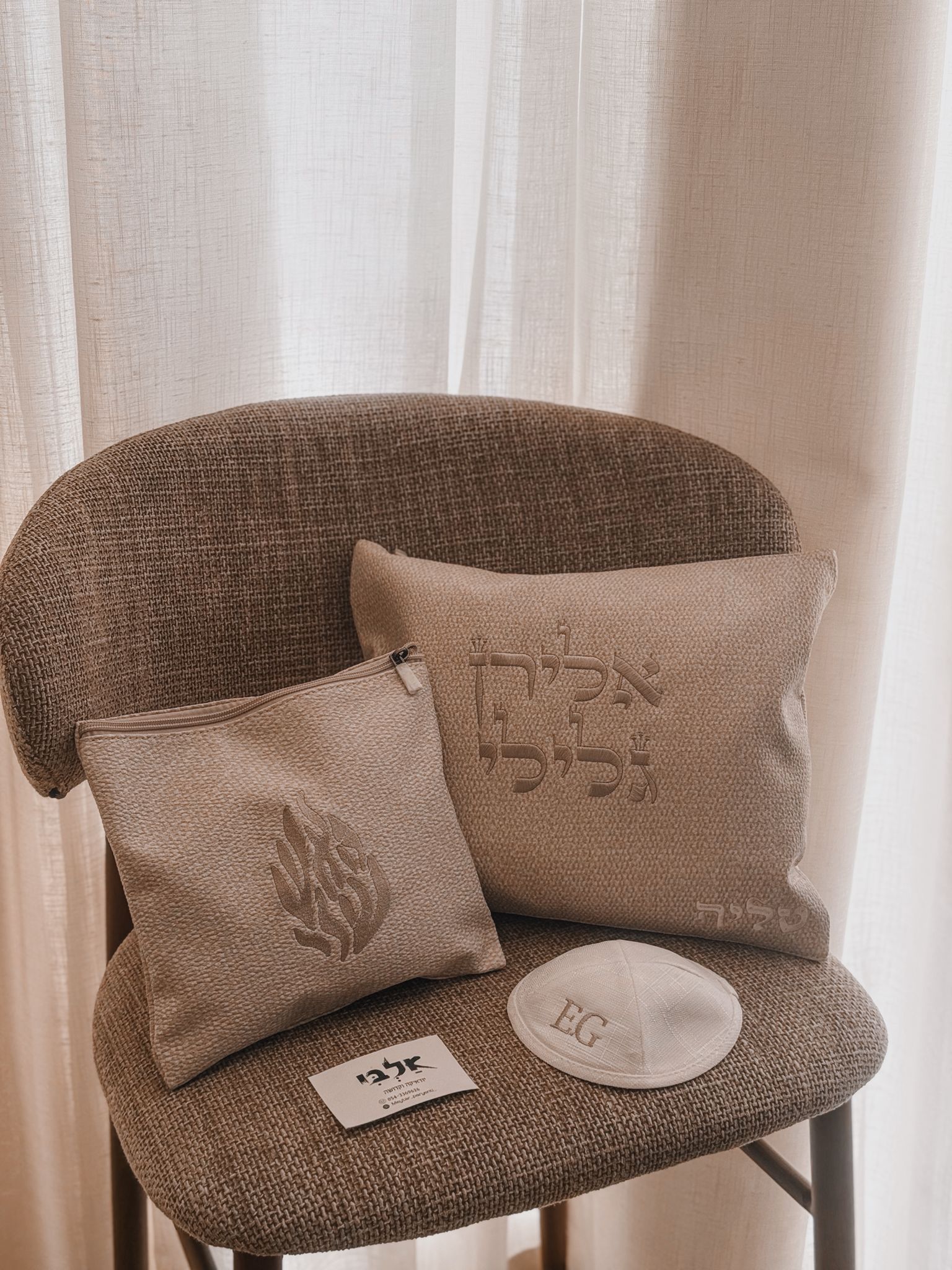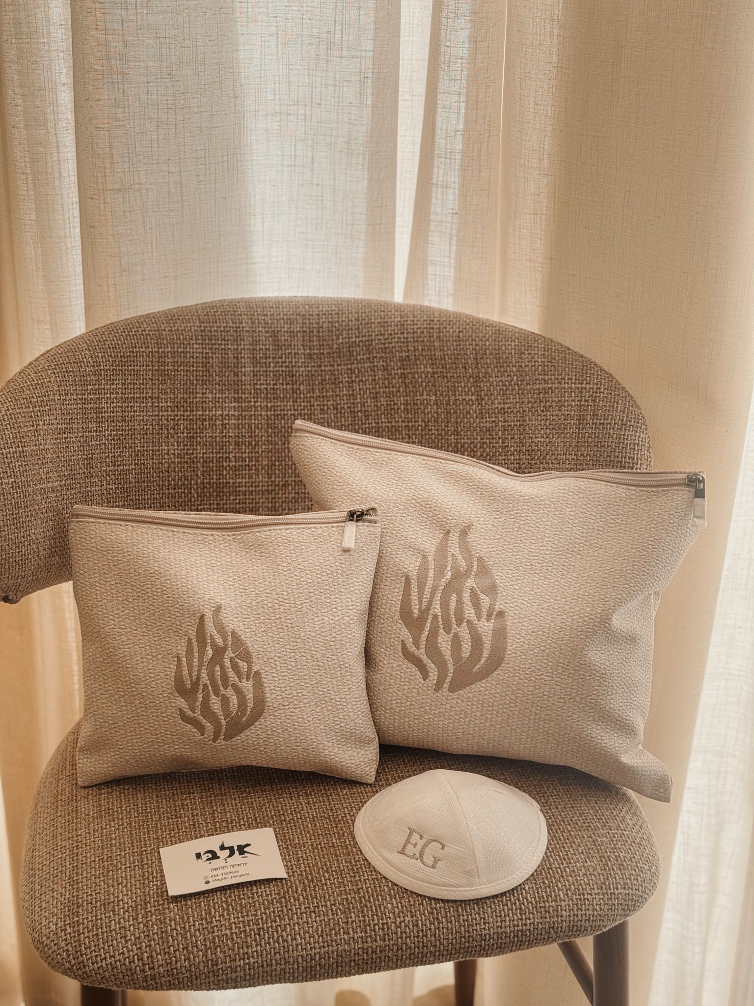 סט תיקים לתפילין וטלית כולל רקמת שם אישי, בגב התיקים רקמת האש שלי + כיפת פשתן לבנה עם רקמה תואמת ראשי תיבות