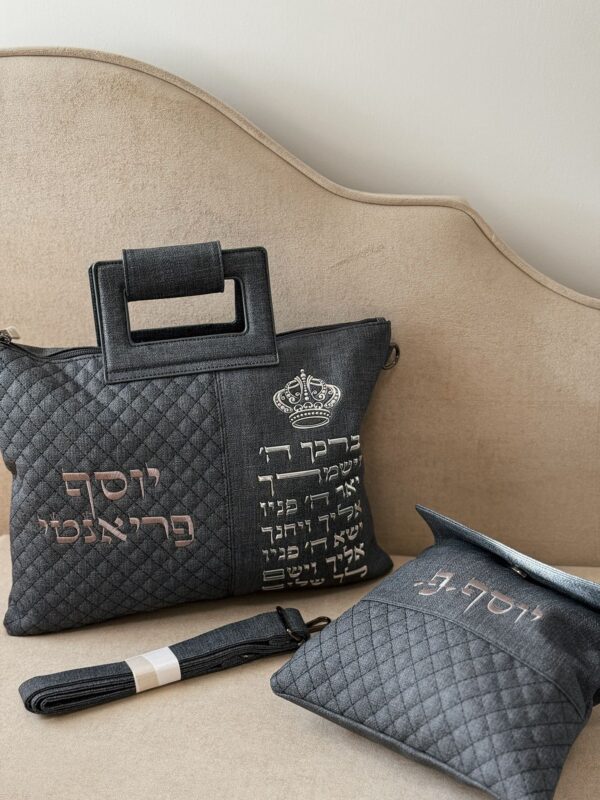 סט תיקים לתפילין וטלית כולל ידית נשיאה ורצועה מתחברת עם רקמת שם אישי ואותיות מובלטות של ברכת "יברכך ה'"